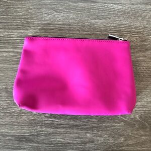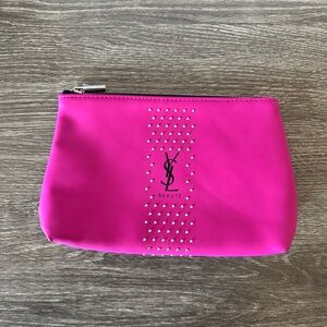 YSL Beauté Beauty Bundle including a vibrant pink cosmetic pouch with silver stud accents, 2 makeup brushes, and drawstring pouch. Perfect for organizing your beauty essentials.