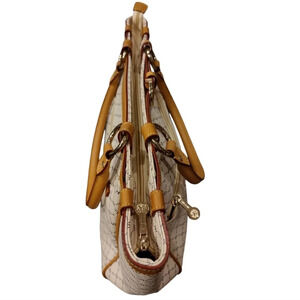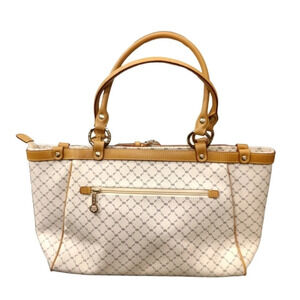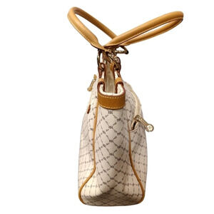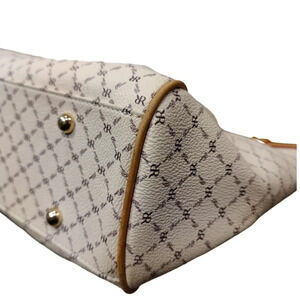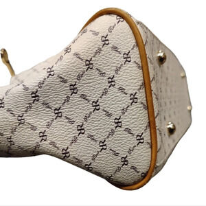A place for all your necessities. Consists of an espresso brown colored RR RIONI monogram print on a sold ivory colored body. Trimmed in leather. Embossed with a gold RIONI Moda Italia emblem. Double rounded handles supported with gold pleated rings. Front and back zipper pockets. Top zip closure opens to a center dividing zipper pocket. Interior side zipper pocket, pocket pouch, and cell phone pouch lined in a golden beige RIONI monogram fabric.