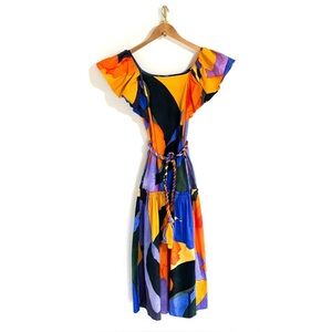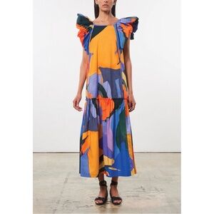 Zarela is a maxi column dress with flared shoulders and exaggerated flutter sleeves. Made from sustainable organic cotton poplin with a custom watercolor print, hand painted in-house.
