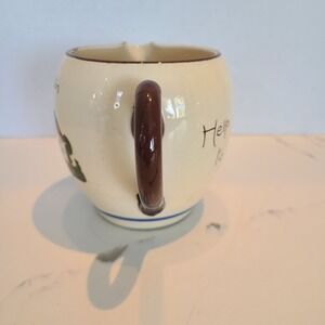 This is a vintage English cottage creamer milk pitcher made of ceramic. It features hand-painted designs in cream, blue, and brown colors. The pitcher has a glossy finish and was produced in the 1930s. It is an original piece and has a printed backstamp. The pitcher was made using a pottery production technique and is a unique, handmade item.