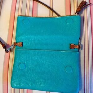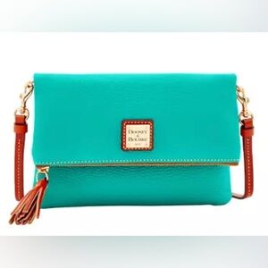 Chic turquoise leather folding crossbody by Dooney & Bourke. Features a sleek design with a tassel accent.