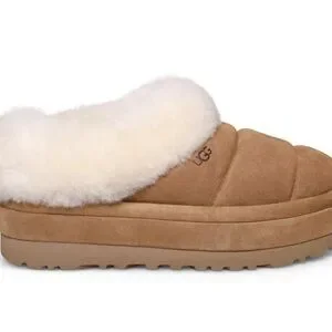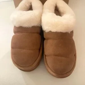 Warm brown slippers featuring a plush cream fur lining. Perfect for comfort and style.