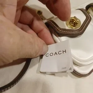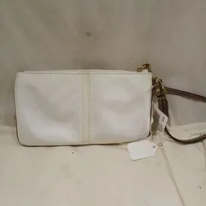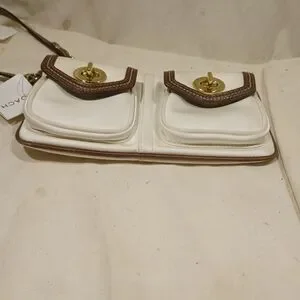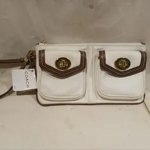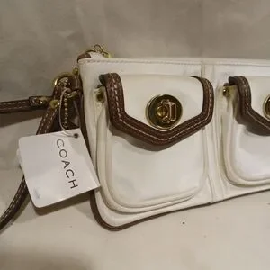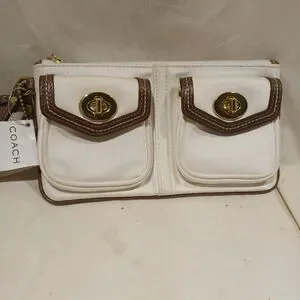 coach wristlet or small bag, notice detachable strap, 8x4 in size, zip to close, 2 outside front pocket, new with tags, turn lock close on pockets