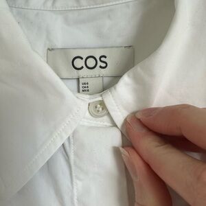 Classic white button-down shirt by COS. Features short sleeves and a chest pocket. Ideal for casual wear. oversized