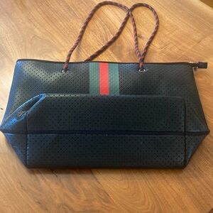 Perfect for summer travel! Zip closure and one interior zip pocket and interior pockets for phone and wallet. Bag measures 19” X 12” and handles measure 14”. Fully lined. Lightweight perfect for the office or travel. Small area of wear on back of bag see last pic.