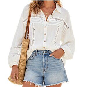 Free People Summer Stars Button Front Blouse Ivory Cream Boho Lace Top XS