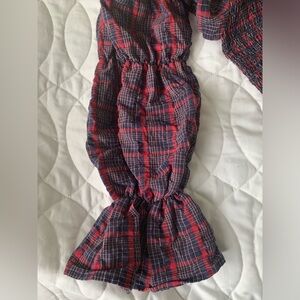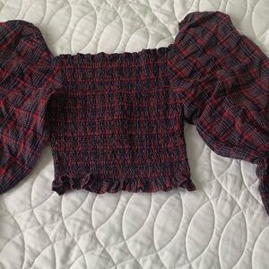 No tags so please refer to measurements. Cotton, plaid, almost a tube top with sleeves. Cute ruffle along the bottom. PTP: 9”– 13” (is meant to stretch)