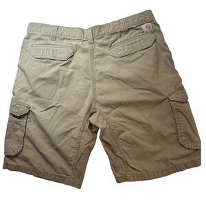 Carhartt men's tan cargo shorts in a relaxed fit. These shorts feature multiple pockets for storage and a durable cotton blend construction. Equipped with belt loops and a button fly closure.