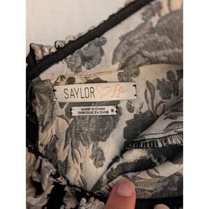 Keywords: Saylor x Free People dress, jacquard mini dress, tapestry fabric dress, floral pattern dress, black mini dress, size medium, exposed zipper back, structured mini dress, boho chic style, festival fashion, romantic mini dress, statement dress, Free People exclusive, textured floral dress, fall party dress, elegant bohemian style, vintage-inspired, cocktail dress, going out dress, boutique style, floral jacquard, woven fabric dress, flattering silhouette, stylish and edgy, wedding guest