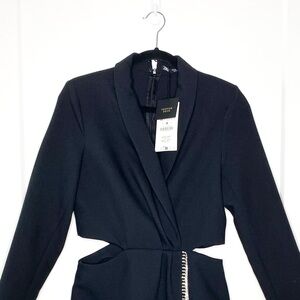 Shorts jumpsuit with lapel collar. Long sleeves with shoulder pads. Hidden zipper at back. Beautiful beaded detail at front. Size medium. New condition.