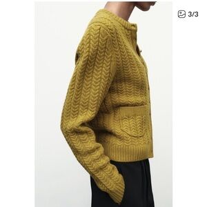 Chic Zara cardigan in olive. Features a classic cable knit design. Ideal for layering and adding warmth.