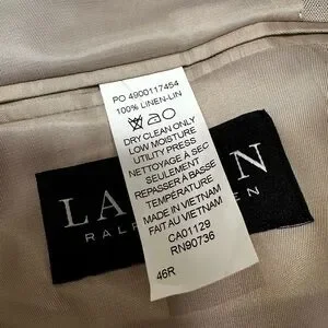 Crafted of 100% linen, this Lauren Ralph Lauren sportscoat is styled with a notched collar, long sleeves, and a two-button closure. This coat is designed with one pocket at the chest and two at bottom front.