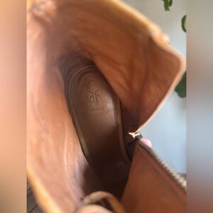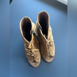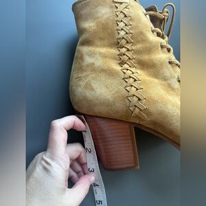 Gorgeous tan/orange suede heels by Frye. Suede is soooo soft and in excellent condition. Unique lace-up style with block heel. Size 8.5.