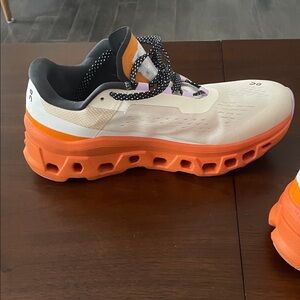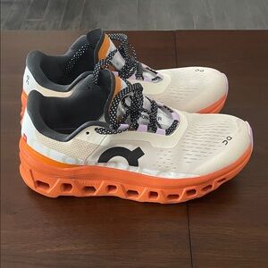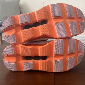 Elevate your active style with women's athletic shoes. Featuring a cream base with vibrant orange soles, these shoes are enhanced by black laces and purple details. Perfect for any fitness enthusiast.