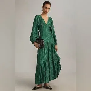 ANTHROPOLOGIE Farm Rio Floral Jacquard V-Neck Maxi Dress Green Petite Size NWT