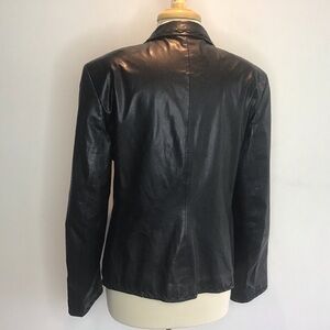 Rene Lezard black leather notched collar/zigzag stitching, 2 button blazer (EU size 42) Please see measurements. This fits like an 8.