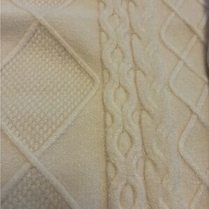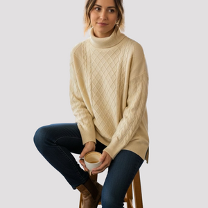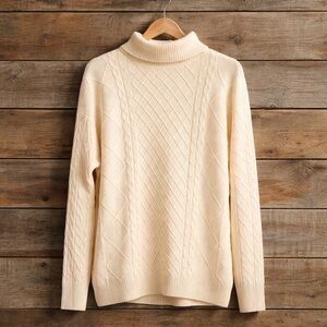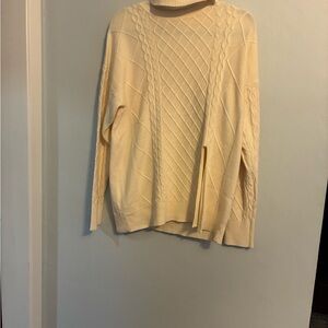 Chic cream turtleneck with cable knit design. Very soft and has a slit on one side for ease of movement. The collar leans towards a cowl collar so it is not a tight fit.