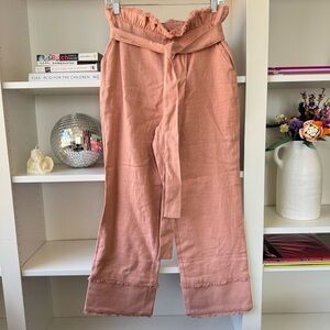 Self: 100% linen Lining: 100% cotton. Frayed ruffle waist with detachable tie belt. Side slant pockets. Fringe trim. Hidden back zipper closure. 17" at the knee and 17" at the leg opening. Style No. LOVF-WP273. Size small. Great preloved condition