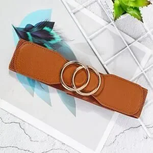 Belt Classic Faux Leather Camel Tan Interlocking Circles Circular Metal Buckle Stretch