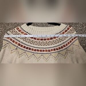 Gently worn Loft knit sweater, size medium. beautiful fall colors. On the front left shoulder, there is a very faint blueish spot, as shown in the photo.