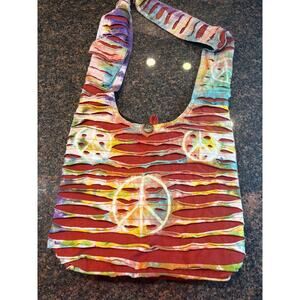 India Boutique red tie-dye boho 100% cotton shoulder/crossbody bag. Red base with multi-colors over front and strap of bag with peace signs. Large interior space with black lining. Phone pocket on strap. Fun piece to add to any wardrobe.