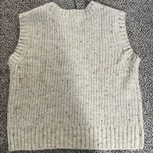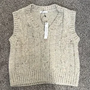 Chic tan V-neck sweater vest. Features cable knit design. Ideal for layering. The cutest details distressing with specks of color in it NWT SIZE small… I’d say it’s oversized