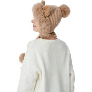 Great Design: Acrylic knit beanie with earflaps for women with lovely 3 pom poms,1 top pom and 2 side earflap pompoms; there is a split in the backside, it is easy for ponytail wearing.In chilly weather, this hat will keep your ears well-guarded.