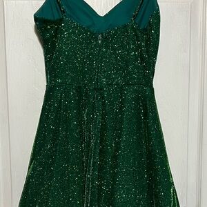 Stunning emerald green shimmer dress with a flattering fitted bodice and flowy skater skirt. Perfect for holiday parties, night out, prom, or special events. Sparkles beautifully in the light!