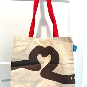 Charming canvas tote bag featuring a playful dog print. Sturdy red handles for easy carrying. Perfect for dog lovers on the go.
