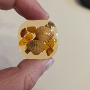 Vintage resin brooch with embedded shells.