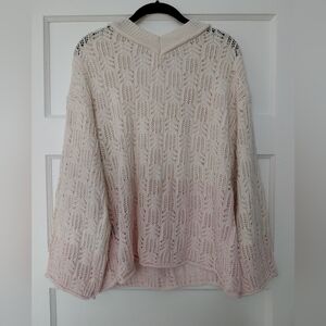 POL V-neck sweater with intricate open-knit design. Soft cream and pink tones fading in a beautiful hombre pattern. Perfect for layering. I love this sweater, especially for spring and Easter. I'm just not loving how I look in the oversized style, otherwise, I would not be parting with this sweater.