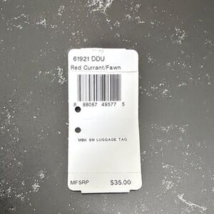 From Coach, Men’s Bleecker small luggage tag in Red Currant and Fawn. It features a buckled closure and a concealed ID window. There are a few faint marks in the leather from production and storage, which will soften up overtime. Otherwise, new, never used.