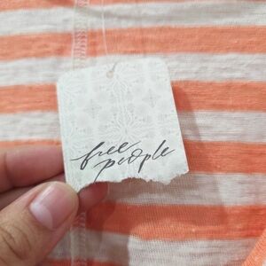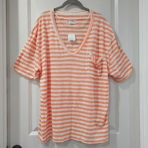 Casual oversized V-neck T-shirt from WE THE FREE with orange grapefruit and white stripes. Features a front pocket. Exposed seams and drop shoulder style. Perfect everyday style.