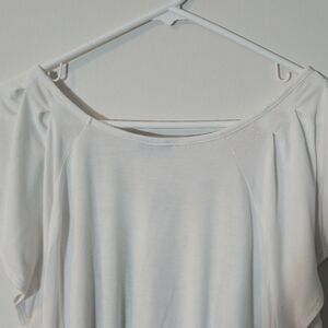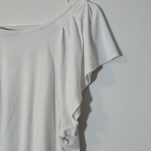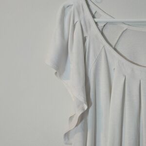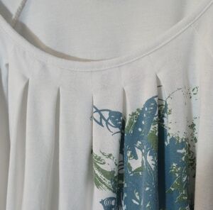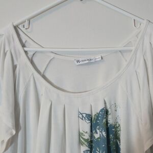 Elevate your everyday wardrobe with this soft and flowy Revolution by Ricki's blouse. Featuring a serene white base, this top showcases a beautiful teal and green botanical graphic with delicate butterfly and floral accents. The design includes a flattering pleated scoop neckline, feminine flutter sleeves, and a comfortable banded hem for a draped look. Crafted from a stretchy rayon blend for all-day comfort. ​Soft rayon-spandex knit ​Short flutter sleeves ​Pleated neckline detail ​Banded elastic-style hem ​97% Rayon, 3% Spandex ​Made in Canada Condition: Good pre-owned condition, no visible flaws. Botanical, ​Boho, ​Cottagecore, Rickis Revolution White Blouse, Plus Size Floral Top, Butterfly Graphic Tee, Rayon Spandex Stretch, Flutter Sleeve Shirt, XXL Women's Top, Teal Green Floral, Pleated Neckline Blouse, Banded Hem Top, Canadian Fashion, Naturecore, Soft Girl, Romantic, Casual Chic, Whimsigoth, Spring Style, Flowy Aesthetic