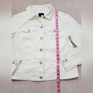 Classic and versatile white denim jacket by The Limited, perfect for layering year-round. Features a structured silhouette with just the right amount of stretch for comfort and ease of movement.