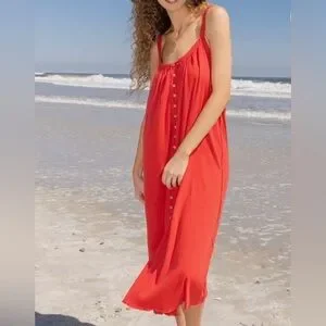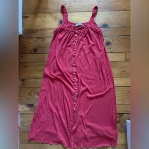 Super comfy midi dress. Functional wooden buttons! Color is truer to the first pictures from the site, my lighting is making it pinker/duller. 51% polyester, 40% cotton, 9% rayon. I’ve also got this in black - check my closet!