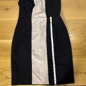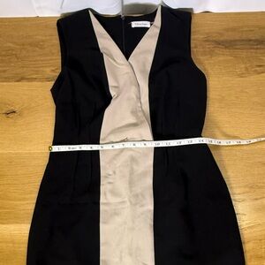 Calvin Klein black and tan colorblock sleeveless sheath dress in size 8, perfect for work, events, or polished evening wear. Flattering tailored silhouette with a deep V neckline and falls just above the knee. The bold vertical colorblocking creates a sleek, elongating look.