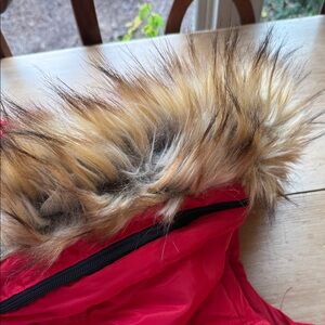 Stylish red puffer vest with a cozy fur hood. Perfect for chilly days.