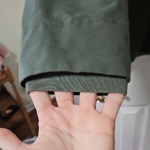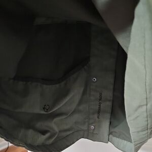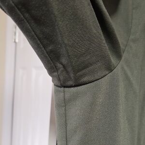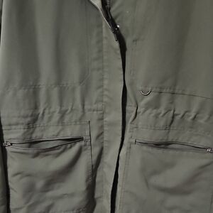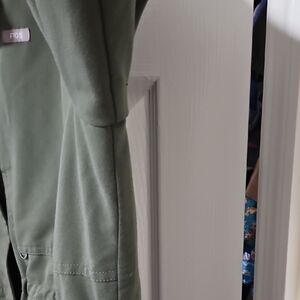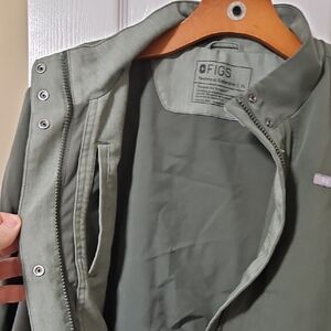 Figs olive green scrub jacket with a sleek design. Features multiple pockets and a high collar. Zip and button front closure. Ideal for any healthcare worker.