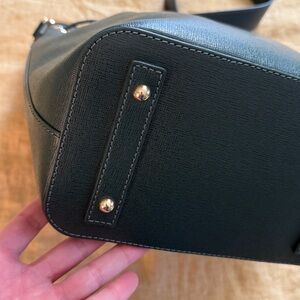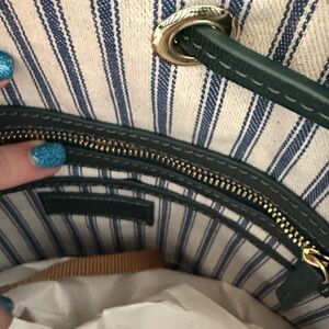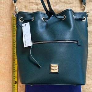 Dooney & Bourke drawstring saffiano leather bucket bag in a rich green, classic gold hardware with the ease of a drawstring closure. New, dustbag shown included, please see attached pics and video to verify condition and for details!