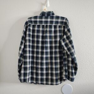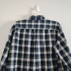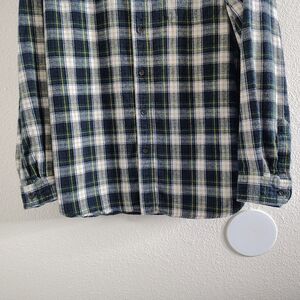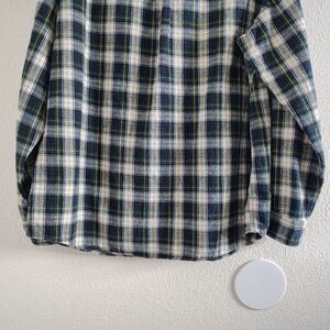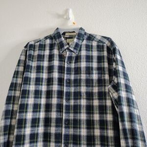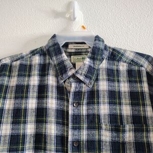 Classic L.L.Bean men’s plaid flannel button-down shirt in a timeless blue, green, and cream colorway. Features a Traditional Fit, long sleeves, button-down collar, and chest pocket.