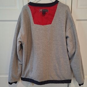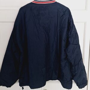 Blue Steve & Barry's pullover jacket. Red embroidered USA on the front. Front kangaroo pocket. 100% nylon shell. Gray cotton/poly lining. Toggle bottom hem.