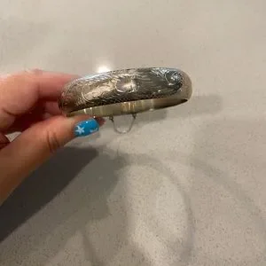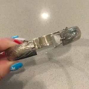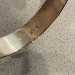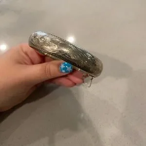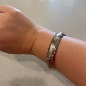 This elegant vintage sterling silver bangle bracelet features a beautiful floral design, perfect for adding a touch of sophistication to any outfit.