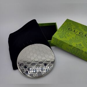 Brand new Gucci Beauty compact mirror featuring an allover GG monogram in a polished silver-tone finish. Opens to dual mirrors for everyday touch-ups with classic Gucci elegance. New in box and unused, complete with original Gucci Beauty green box and black pouch — ideal for gifting or collection.
