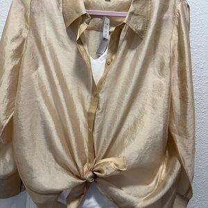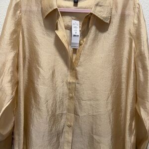 Chic button-down shirt in a soft beige/gold tone. Features a classic collar and long sleeves. Perfect for versatile styling.