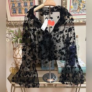 Beautiful CIDER sheer top with black floral pattern. Perfect for layering with your tanks and cami’s. The large sheer bell sleeves are gorgeous! This blouse is New With Tags💕