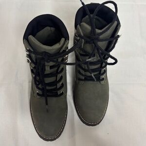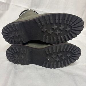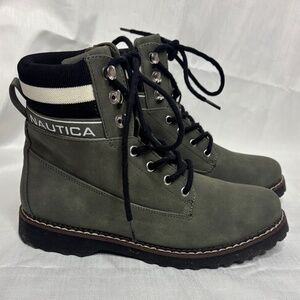 Nautica Galiah green hiking combat style boots. Size 7.5 women’s. Olive green synthetic upper. Black laces with black and white accents. Silver hardware eyelets. Thick treaded rubber outsole. Lightweight construction. Excellent used condition. No obvious signs of wear.