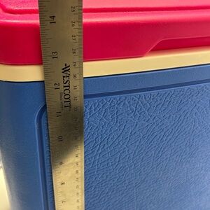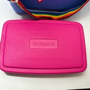 Igloo Tag Along 24 vintage 90s rainbow strap cooler. The colours on this beauty are awesomely retro! Royal blue and pink with a rainbow striped woven fabric strap. Lid can be flipped over and used as a 4-can cup holder.