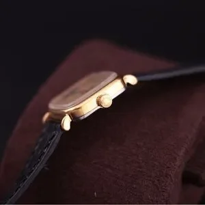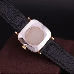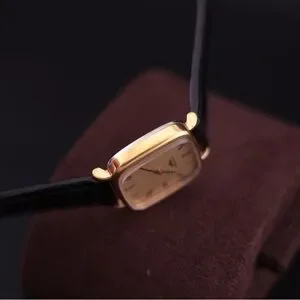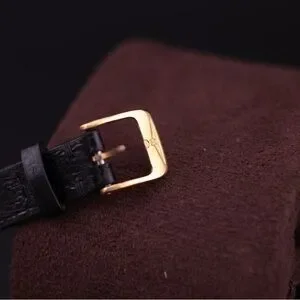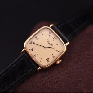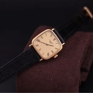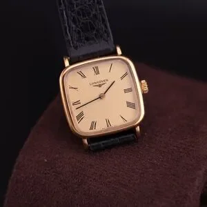 Elegant Longines watch with a gold square face and black leather strap. Roman numeral markers add a classic touch.