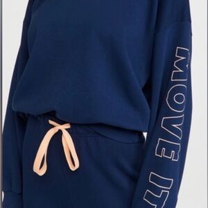 Stylish deep blue sweatshirt with bold sleeve lettering. Perfect for casual wear.